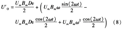 由式(8)可以看出信號(hào)經(jīng)過(guò)信號(hào)處理之后得到U'0,交流部分[UmBmω*sin(2ωt)/2]-[UmBmDv*cos(2ωt)]+[UmBm ω ² cos(2ωt)/2]可經(jīng)過(guò)低通濾波器濾除,直流部分UmBm Dv/2經(jīng)過(guò)放大后直接輸人MCU進(jìn)行處理轉(zhuǎn)換成流量信號(hào)顯示出來(lái)。