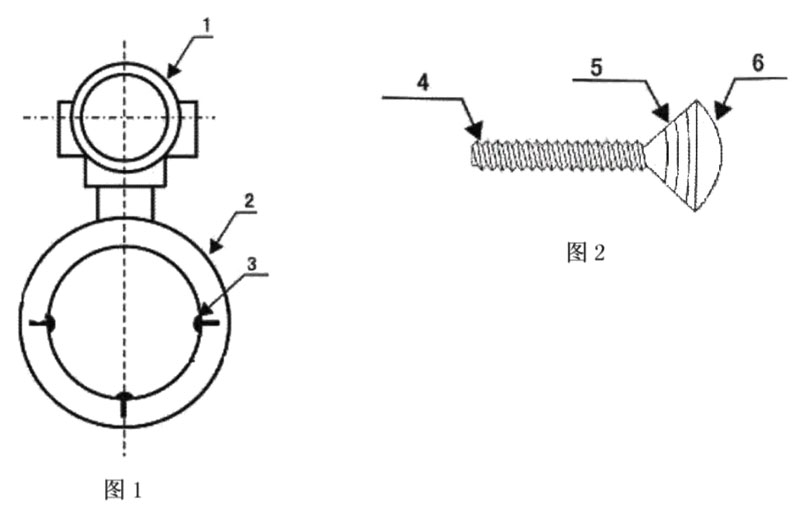 在實施例中,陀螺式電極智能電磁流量計包含傳感器筒體2、主機1、電極3,主機設置在傳感器筒體上,傳感器為筒狀結構,電極為陀螺式結構,并有電極桿4電極桿上設有螺紋,電極布置在傳感器筒體內,電極桿與傳感器筒體之間通過螺紋連接。電極包含電極杄4、電極托臺5、接液面6,電極托臺與接液面一起構成陀螺結構,電極托臺與電極桿連為一體;接液面是電極與被測液體接觸面。電極桿上的螺紋旋進傳感器筒體內的內襯材料里,電極桿的長度盡量長一些。電極托臺的形狀為錐型,電極托臺外緣與電極桿中心線成45°角,與接液面一起構成陀螺結構。