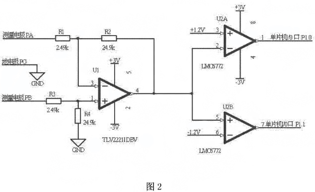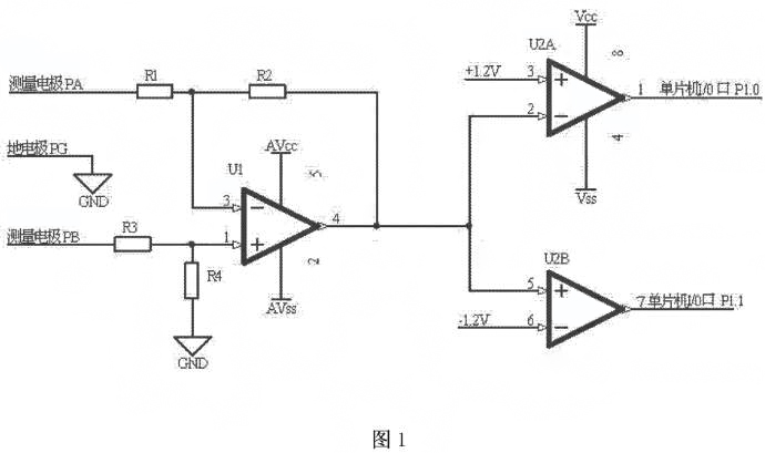 如圖1所示,應(yīng)用于電磁流量計(jì)極化電壓檢測的電路,測量電極PA與電阻R1的端連接,電阻R1的另一端與電阻R2的一端、運(yùn)算放大器U1的反相輸入端3腳連接,電阻R2的另一端與運(yùn)算放大器U1的輸出端4腳、雙路比較器通道一U2A的反相輸入端2腳、雙路比較器通道二U2B的同相輸入端5腳連接,測量電極PB與電阻R3的一端連接,電阻R3的另一端與電阻R4的一端、運(yùn)算放大器U1的同相輸入端1腳連接,電阻R4的另一端與地連接,地電極PG與地連接,運(yùn)算放大器U1的電源供電端5腳與正電源VAcc連接,運(yùn)算放大器U1的接地端2腳與負(fù)電源WAss連接,雙路比較器通道一U2A的同相輸入端3腳與+1.2V連接,雙路比較器U2A的電源供電端8腳與正電源VAcc連接,雙路比較器U2A的接地端4腳與負(fù)電源wAss連接,雙路比較器通道一U2A的輸出端1腳與單片機(jī)的I/O口P1.0連接,雙路比較器通道二U2B的反相輸入端6腳與-1.2V連接,雙路比較器通道二U2B的輸出端7腳與單片機(jī)的I/O口P1.1連接如圖2所示,測量電極PA與電阻Rl的一端連接,電阻R1的另一端與電阻R2的端、運(yùn)算放大器U1的反相輸入端3腳連接,電阻R2的另一端與運(yùn)算放大器U1的輸出端4腳、雙路比較器通道一U2A的反相輸入端2腳、雙路比較器通道二U2B的同相輸入端5腳連接,測量電極PB與電阻R3的一端連接,電阻R3的另一端與電阻R4的一端、運(yùn)算放大器UI的同相輸入端1腳連接,電阻R4的另一端與地連接,地電極PG與地連接,運(yùn)算放大器U的電源供電端5腳與正電源+3連接,運(yùn)算放大器UI的接地端2腳與負(fù)電源-3V連接,雙路比較器通道一U2A的同相輸入端3腳與+1.2V連接,雙路比較器U2A的電源供電端8腳與正電源+3V連接,雙路比較器U2A的接地端4腳與負(fù)電源-3V連接,雙路比較器通道U2A的輸出端1腳與單片機(jī)的I0口P1.0連接,雙路比較器通道二U2B的反相輸入端6腳與-1.V連接,雙路比較器通道二U2B的輸出端7腳與單片機(jī)的I/0口P1.1連接。