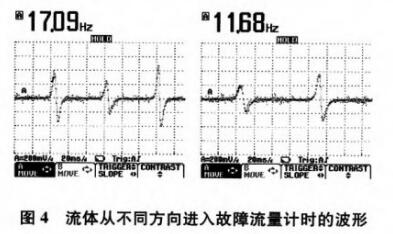 圖4為流體從不同方向流入時流量變送器時輸出波形