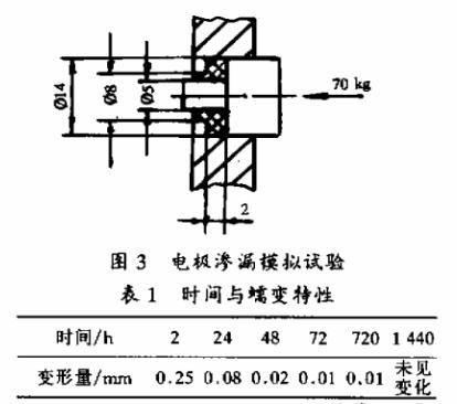 電極滲漏模擬試驗(yàn)如圖3。電極密封面時(shí)間與變特性測(cè)試數(shù)據(jù)如表1
