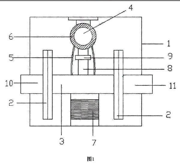 本實(shí)用新型抗震型旋進(jìn)旋渦流量計(jì)將進(jìn)氣口10和出氣ロ11分別通過連接頭2與殼売體3連接,將流量顯示器4通過旋進(jìn)螺栓9連接在連接桿8上,再將彈簧7安裝在殼體3底部,將連接桿8包裏在流量顯示器4外側(cè),以達(dá)到保護(hù)旋進(jìn)旋渦流量計(jì)的目的,箱體1作為旋進(jìn)旋渦流量計(jì)第 一道保護(hù)措施,連接桿8和彈簧7作為旋進(jìn)旋渦流量計(jì)第 二道保護(hù)措施,兩者相互配合使用共同保護(hù)旋進(jìn)旋渦流量計(jì)。